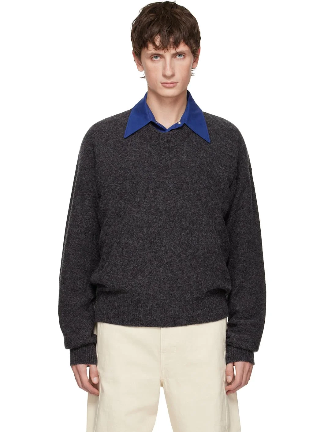 Marled knit wool sweater. · Rib-knit V-neck, hem, and cuffs · Dropped shoulders Supplier color: Grape melange 100% wool. Made in Italy 252646M206000