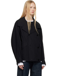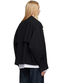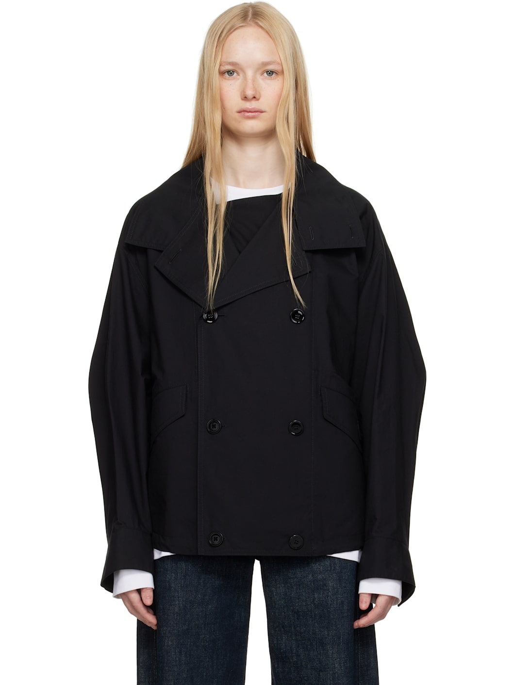 Lightweight plain-woven Ventile® cotton jacket. Water-repellent. · Button fastening at spread collar for alternate styling · Double-breasted button closure · Flap pockets · Concealed cord-lock drawstring at hem · Dropped shoulders · Adjustable button tab at cuffs · Concealed vents at storm flap · Patch pockets at interior · Corozo hardware Supplier color: Black 100% cotton. Made in Lithuania 251646F063001
