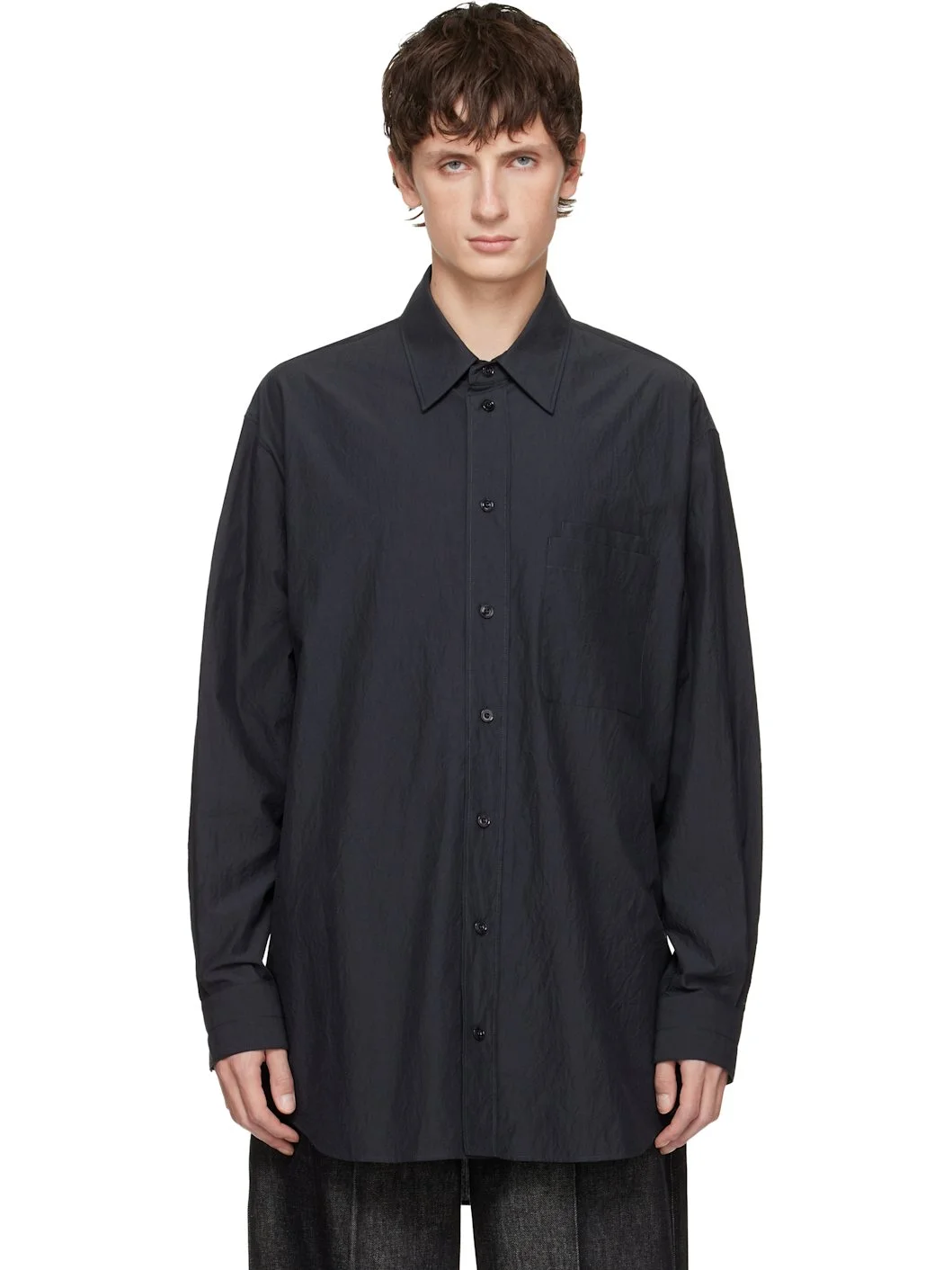 Lightweight crinkled cotton sateen shirt. · Spread collar · Button closure · Patch pockets at chest · Shirttail hem · Box pleat at back yoke Supplier color: Charcoal 100% cotton. Made in Tunisia 252646M192004