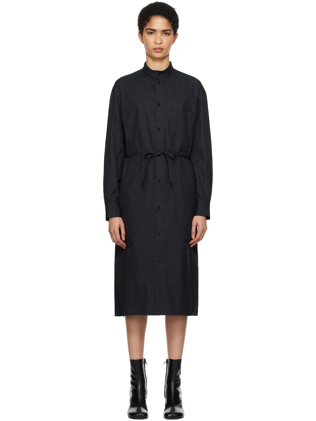 Cotton poplin midi dress. · Band collar · Button closure · Patch pocket at chest · Darts and integrated self-tie belt at waist · Vented side seams · Adjustable single-button barrel cuffs · Twin pleats at back yoke · Unlined Supplier color: Caviar 100% cotton. Made in Romania 242646F054005