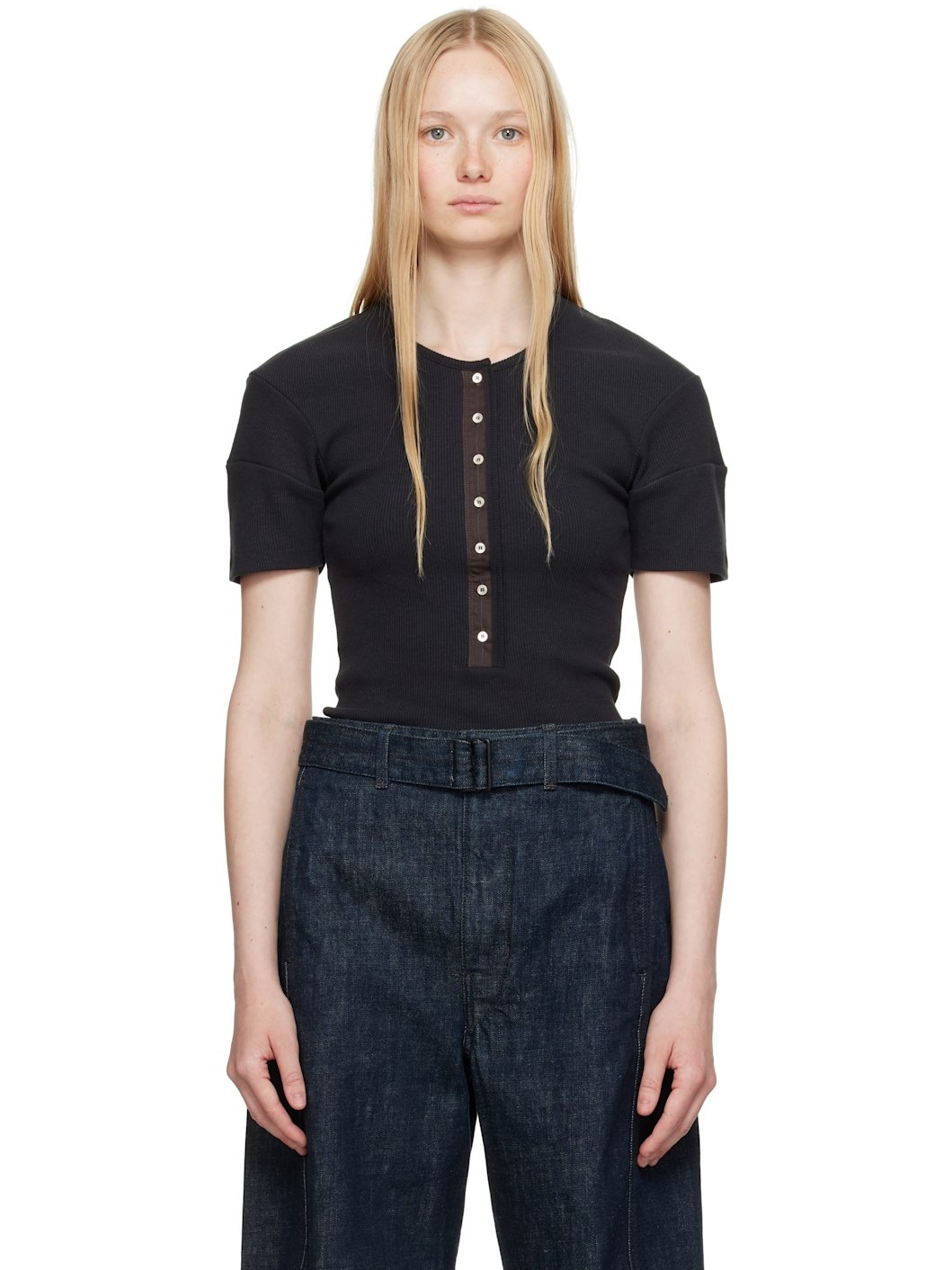 Stretch rib-knit cotton- and linen-blend T-shirt. · Crewneck · Seven-button twill placket · Dropped shoulders · Paneled cuffs · Mother-of-pearl hardware Supplier color: Jet black Body: 69% cotton, 29% linen, 2% elastane. Trim: 100% cotton. Made in Portugal 251646F110000