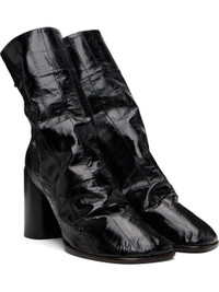 Ankle-high crackled eel leather boots. · Zip closure at inner side · Stacked leather block heel with rubber injection · Leather sole · Heel: H3.5" Supplier color: Black Upper: eel leather. Sole: leather, rubber. Made in Portugal 252646F113004