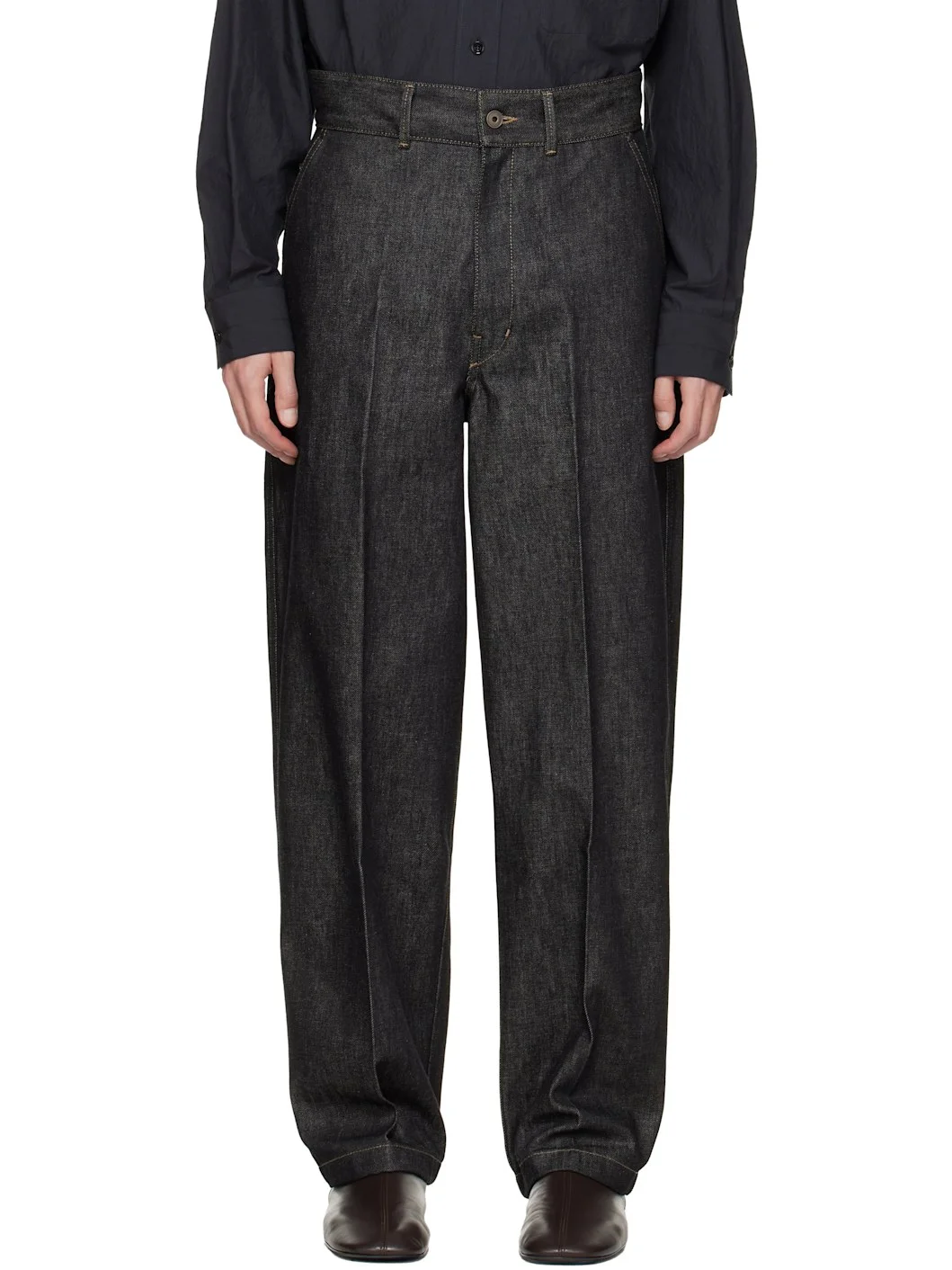 Non-stretch denim jeans. · Yarn-dyed denim · Wide-leg · Belt loops · Five-pocket styling · Zip fly · Pleated front and back legs · Leather logo patch at back waistband Supplier color: Slate Body: 100% cotton. Pocket lining: 100% cotton. Trim: 100% cow leather. Made in Morocco 252646M186006