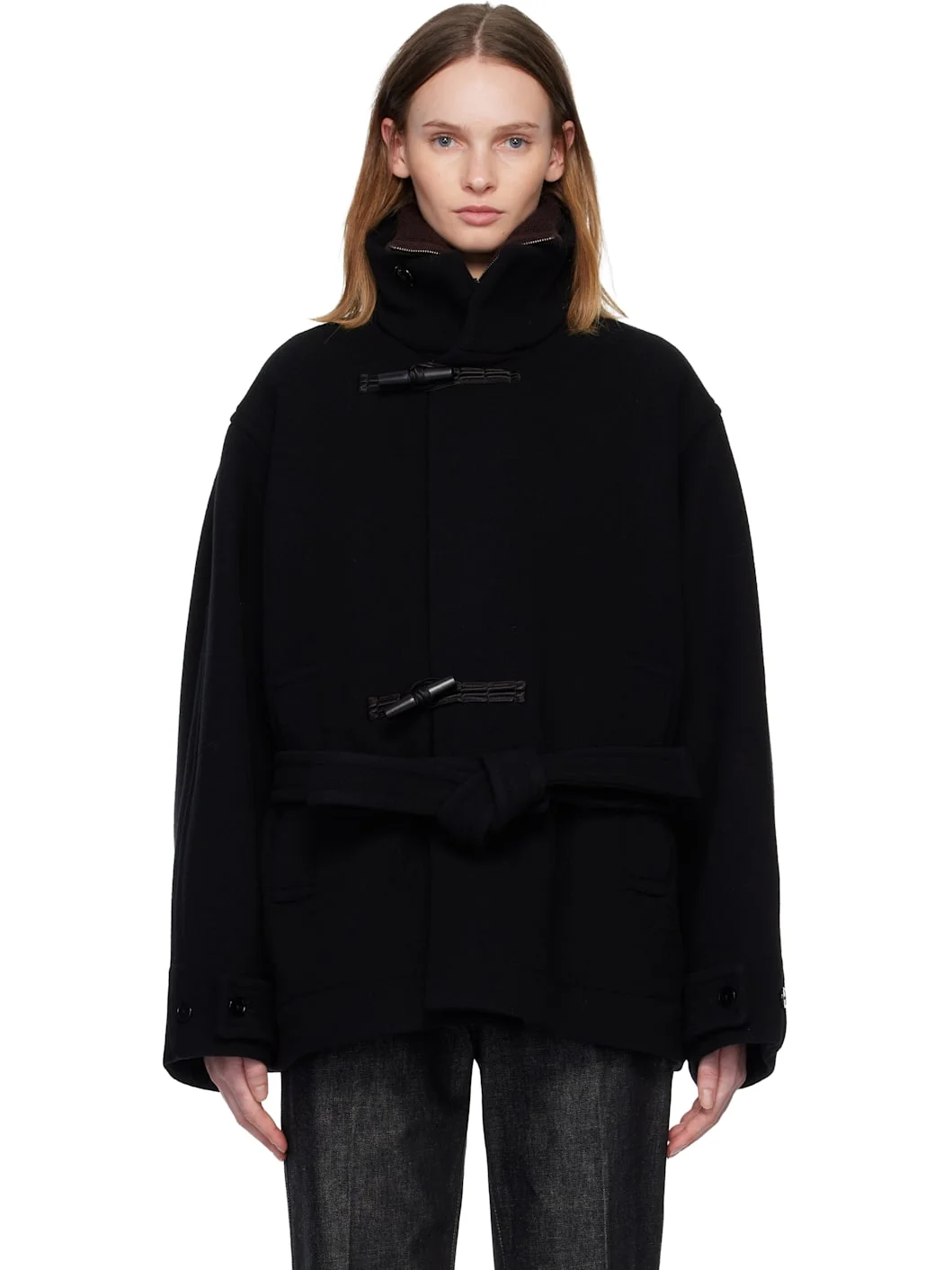 Wool melton coat. · Stand collar · Toggle fastening · Concealed press-stud closure · Welt pockets at front · Belt loops at waist · Detachable self-tie belt · Adjustable button tab at cuffs · Patch pocket at interior · Partial twill lining Supplier color: Black Body: 100% wool. Lining: 100% cotton. Made in Lithuania 252646F059009