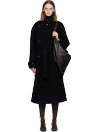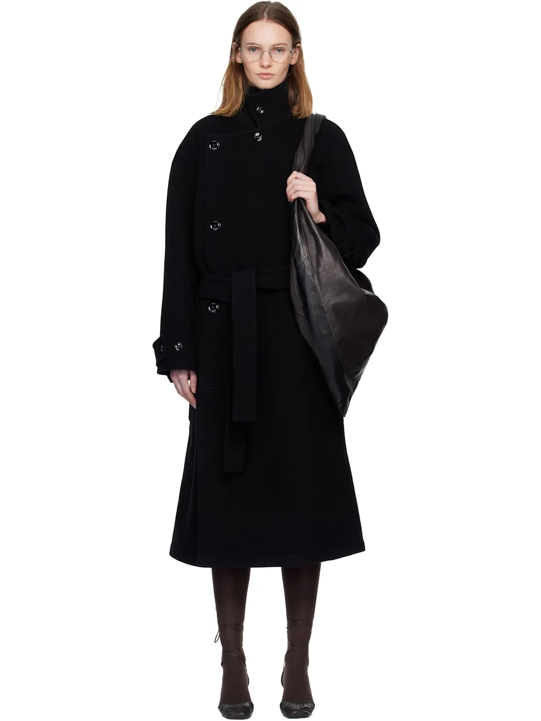 Double-faced wool melton coat. · Wrap construction · Button fastening at stand collar · Offset button closure · Patch pocket at front · Belt loops at waist · Detachable self-tie belt · Adjustable button tab at cuffs · Patch pocket at interior Supplier color: Black Body: 100% wool. Pocket lining: 100% cotton. Made in Romania 252646F059007