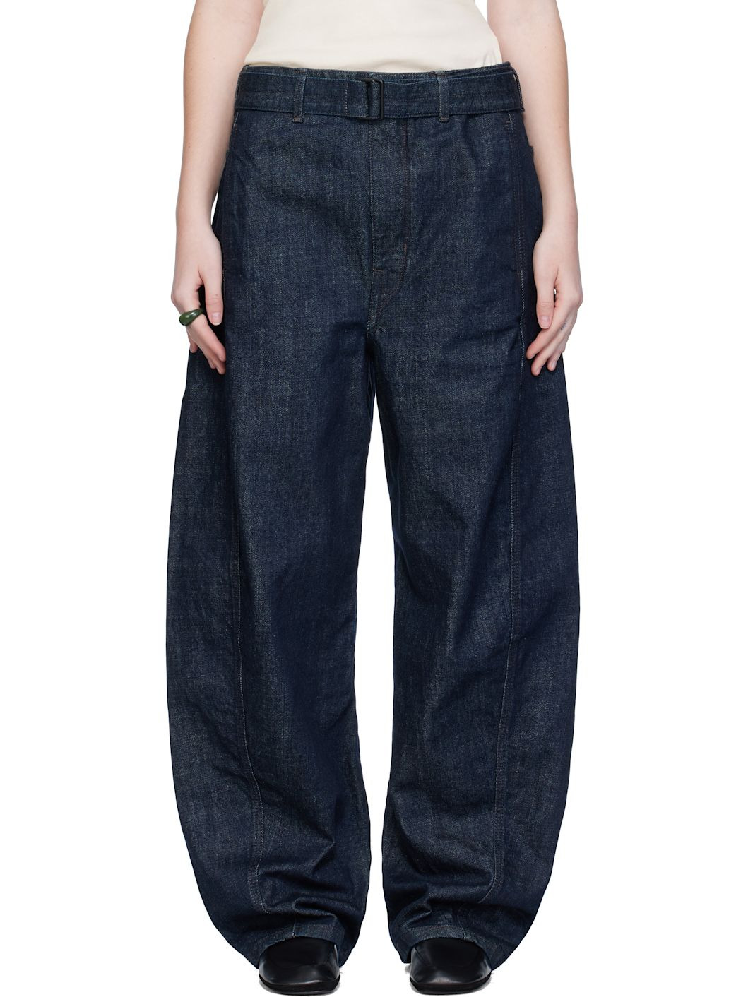 Heavyweight non-stretch denim jeans. · Fading throughout · Mid-rise · Belt loops · Detachable cinch belt · Four-pocket styling · Zip fly · Twisted outseams · Leather logo patch at back waistband · Contrast stitching in brown Supplier color: Denim indigo Body: 100% cotton. Pocket lining: 65% polyester, 35% cotton. Trim: 100% leather. Made in Italy 252646F069007