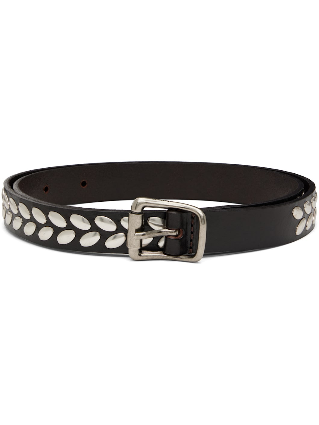 Vegetable-tanned buffed leather belt. · LWG-certified leather · Studs throughout · Logo-engraved pin-buckle fastening · Silver-tone hardware · W0.75" Supplier color: Dark brown Leather. Made in Italy 252646M131004