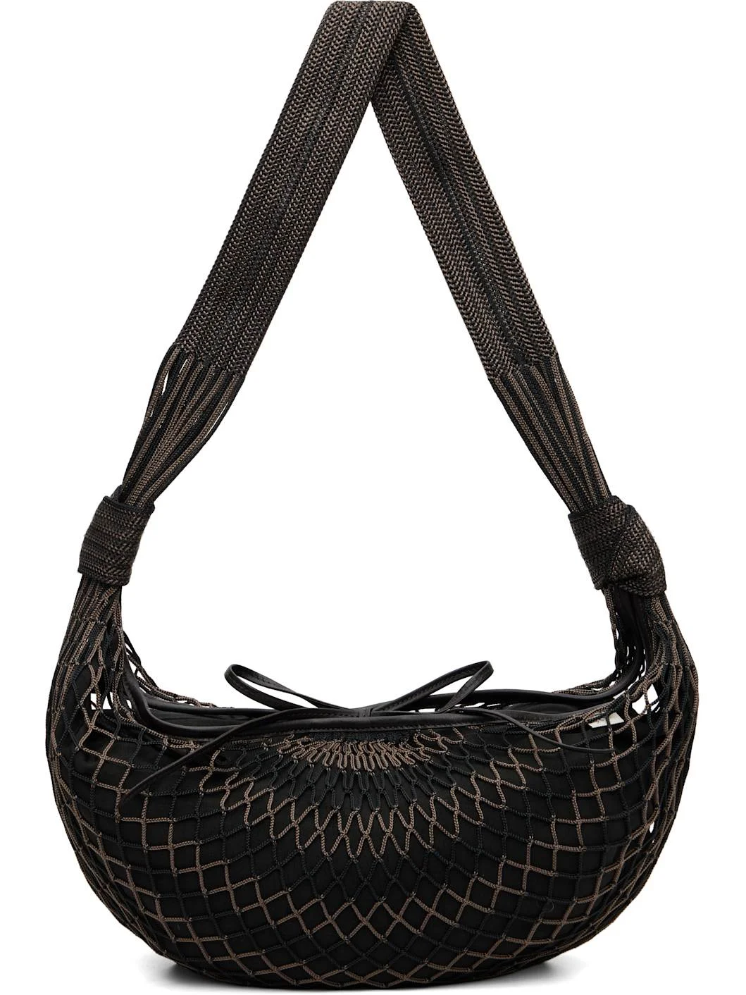 Filt® 1860 open-knit netting messenger bag. · Buffed lambskin trim throughout · Knotted detailing at fixed knit crossbody strap · Self-tie closure at open throat · Detachable canvas zip compartment · Zip pocket at interior · H8.5" x W19" x D2.5" Supplier color: Chevron Marron Glace/Black Textile. Made in France 261646M170052