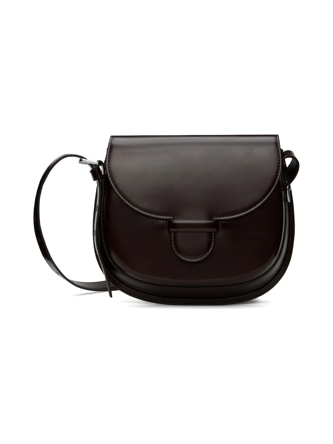 Structured vegetable-tanned LWG-certified polished leather shoulder bag in brown. · Adjustable crossbody strap · D-ring at side · Patch pocket at back face · Magnetic tab-slot flap · Patch pocket at interior · Grained lambskin lining · Logo-engraved silver-tone hardware · H8" x W9.5" x D2" Part of the Molded bag collection. Supplier color: Ristretto