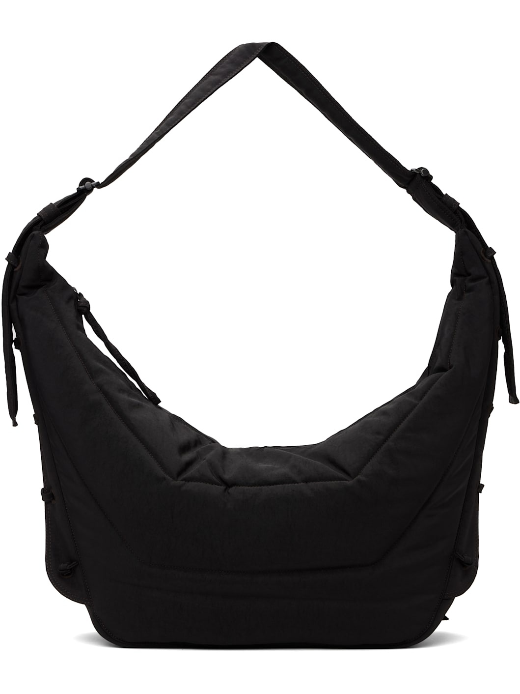 Padded and quilted GRS-certified recycled nylon canvas messenger bag in brown. · Water-repellent and garment-dyed · Adjustable and detachable padded crossbody strap · Embroidered eyelets and lace-up detailing at sides · Zip closure · Zip pocket at interior · Canvas lining · H7.5" x W20.5" x D5" Supplier color: Dark chocolate Textile. Made in Italy 251646M170033