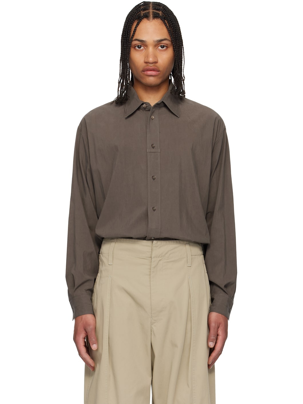 Lightweight lyocell-blend poplin shirt. · Loose-fit · Spread collar · Button closure · Loop at placket · Shirttail hem · Dropped shoulders · Pleats at adjustable single-button barrel cuffs · Box pleat at back yoke · Mother-of-pearl hardware Supplier color: Walnut 69% lyocell, 31% polyamide. Made in Portugal 251646M192020