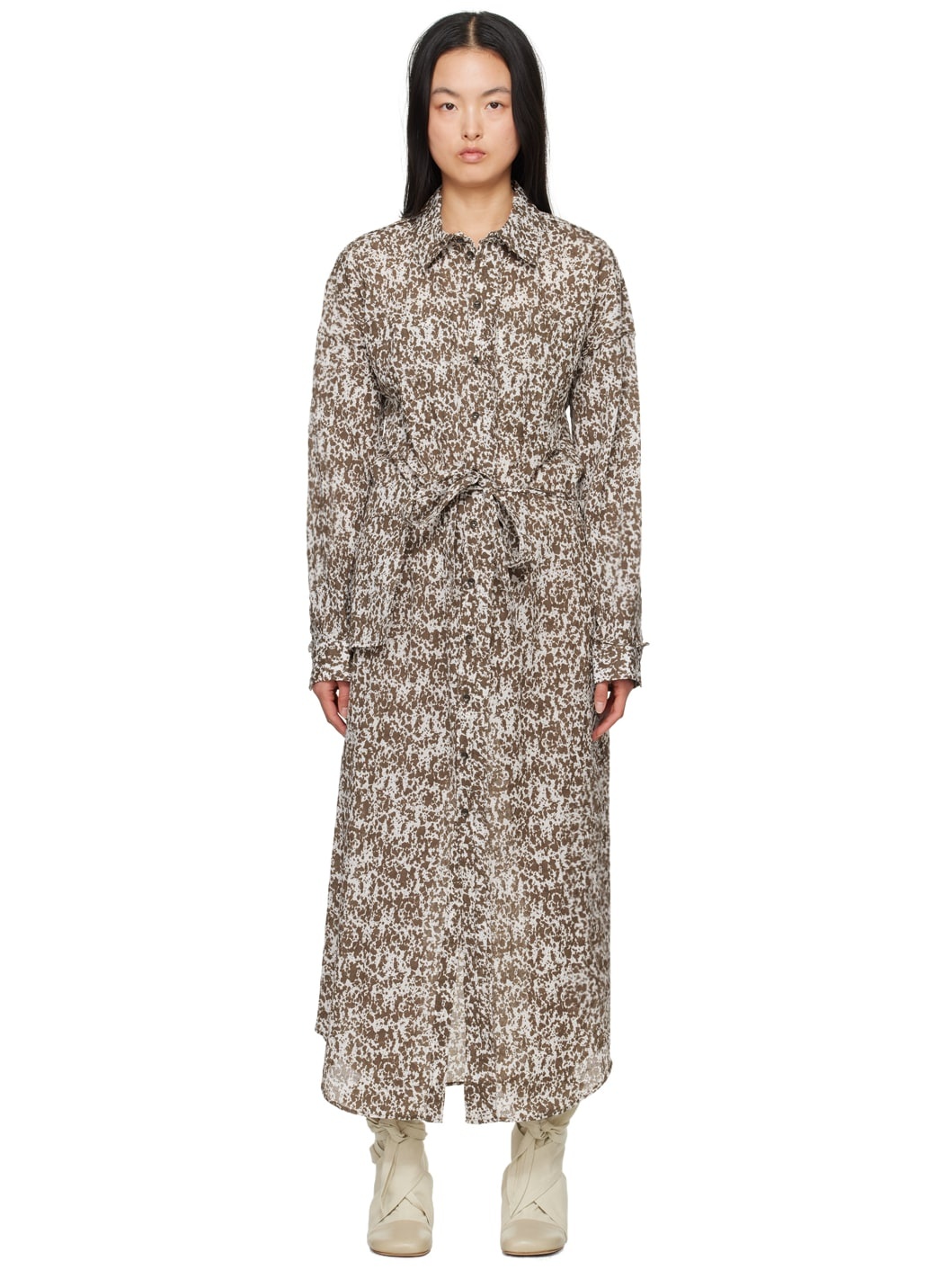 Cotton crepe gauze dress. Graphic pattern printed throughout. · Spread collar · Button closure · Patch pockets · Belt loops and detachable self-tie belt with pouch · Curved hem · Dropped shoulders · Single-button barrel cuffs Supplier color: Cream/Espresso 100% cotton. Made in Portugal 241646F054023
