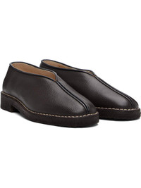 Grained calfskin slip-on loafers. · LWG-certified calfskin · Square toe · Piping at vamp and collar · Buffed leather lining · Topstitching at welt · Crepe rubber sole Supplier color: Dark brown Upper: calfskin. Sole: rubber. Made in Portugal 252646F121004