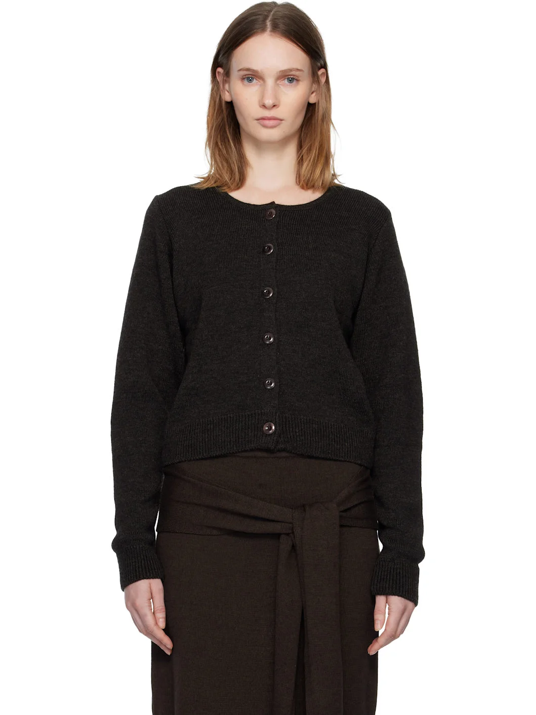 Rib-knit alpaca-blend cardigan. · Rib-knit crewneck, hem, and cuffs · Button closure Supplier color: Dark espresso 45% acrylic, 40% alpaca, 15% wool. Made in Portugal 252646F095007