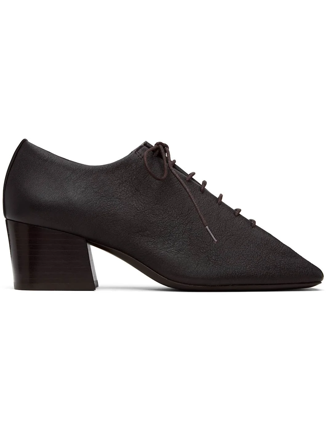 Lightweight grained lambskin heels. · Single-piece upper · Square toe · Lace-up closure · Leather lining · Stacked leather heel · Leather sole with rubber heel · Heel: H2" Supplier color: Dark Chocolate Upper: lambskin. Sole: leather, rubber. Made in Portugal 252646F122000