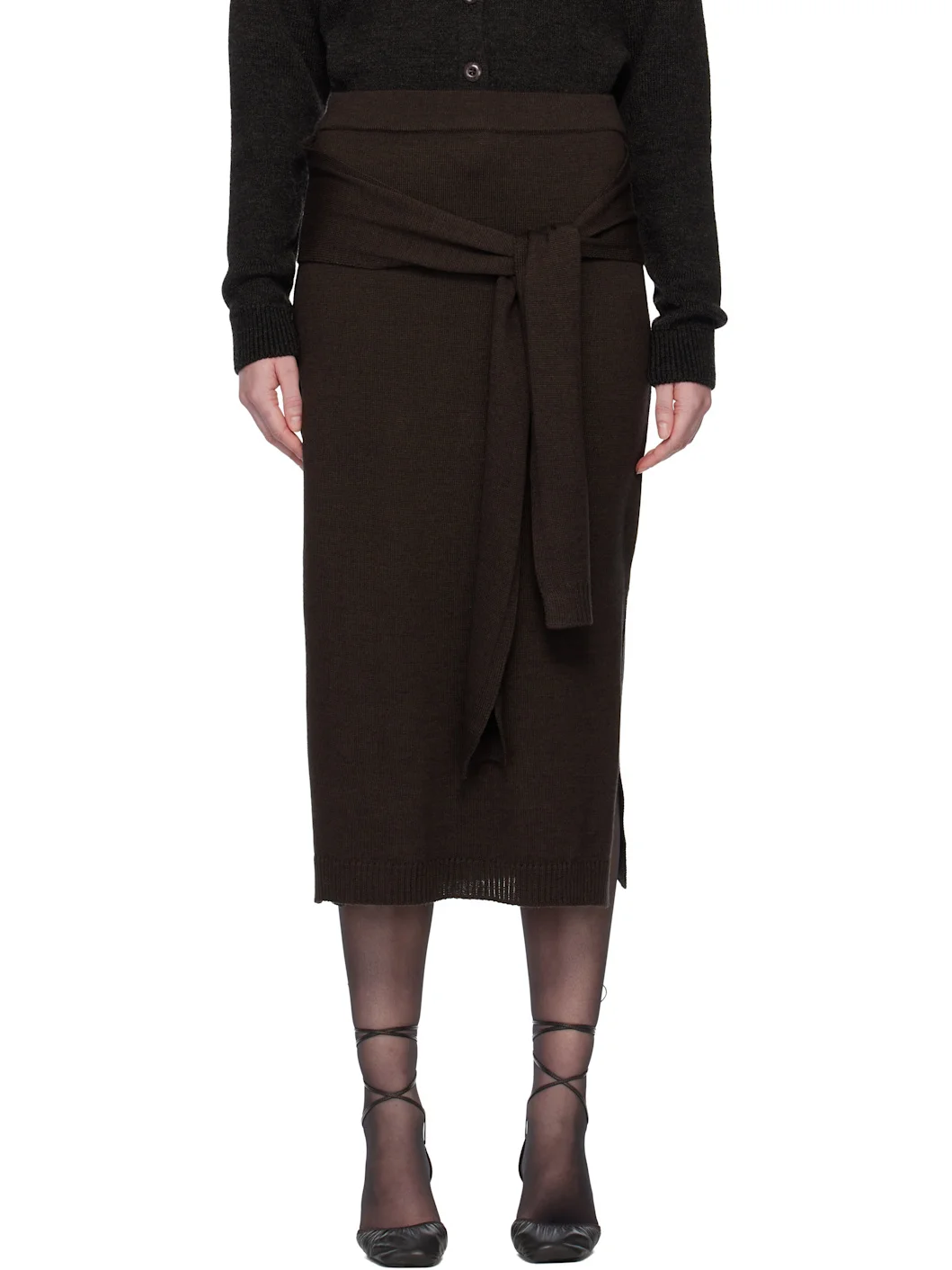 Knit wool-blend midi skirt. · Elasticized waistband · Knit self-tie straps at front · Foldover panel at back waist · Rib-knit hem · Vented side seams Supplier color: Dark cacao 50% wool, 50% acrylic. Made in Portugal 252646F092004
