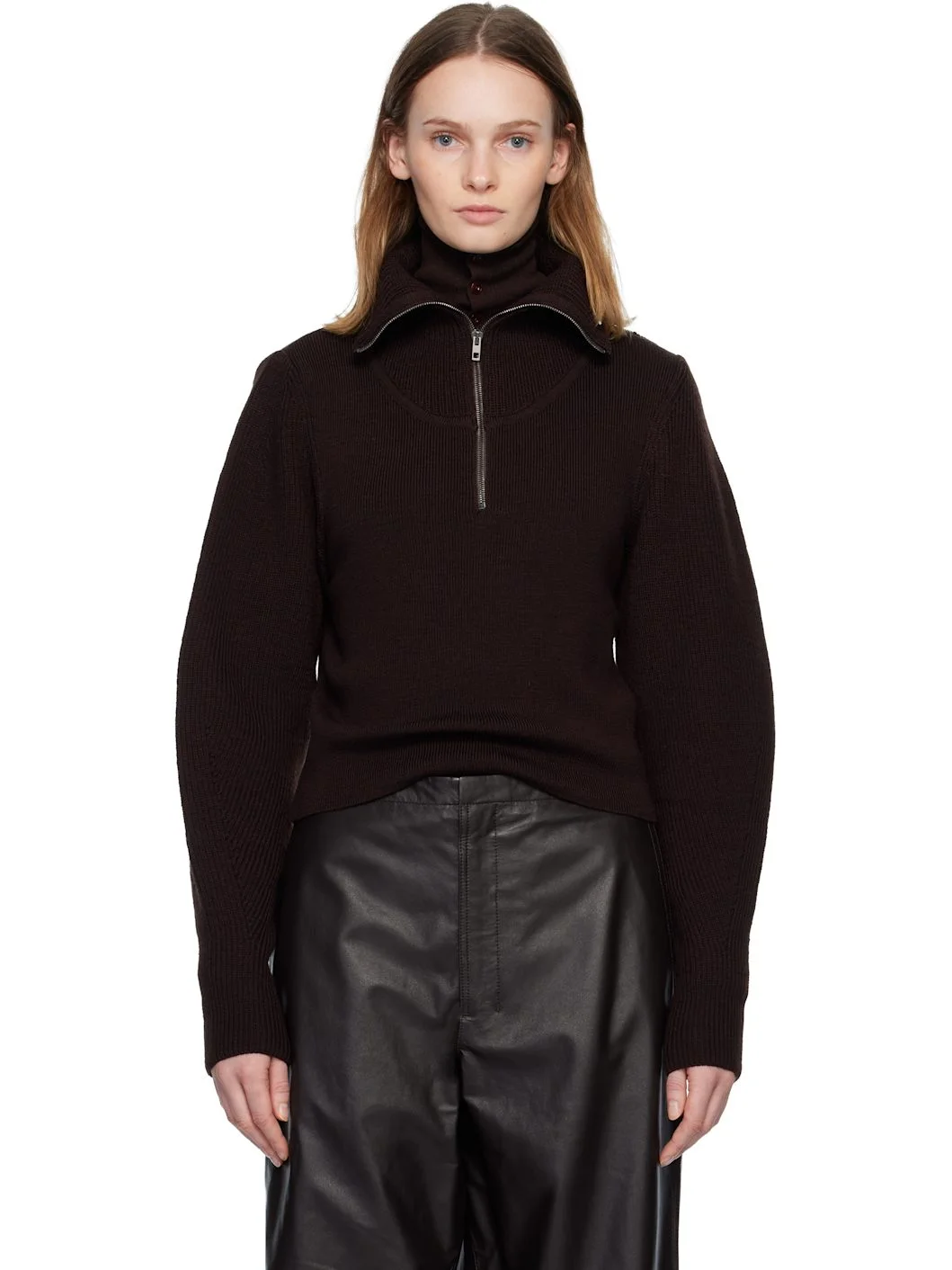 Rib-knit wool sweater. · Stand collar · Half-zip closure Supplier color: Aubergine 100% wool. Made in Portugal 252646F097003