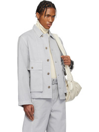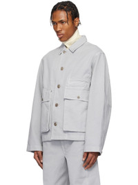 Boxy-fit heavyweight non-stretch denim jacket. · Spread collar · Button closure · Welt pocket, flap pockets, and seam pockets · Button fastening at cuffs · Pleats at back yoke · Adjustable button tabs at back hem · Corozo hardware Supplier color: Snowy blue grey 100% cotton. Made in Morocco 251646M177000