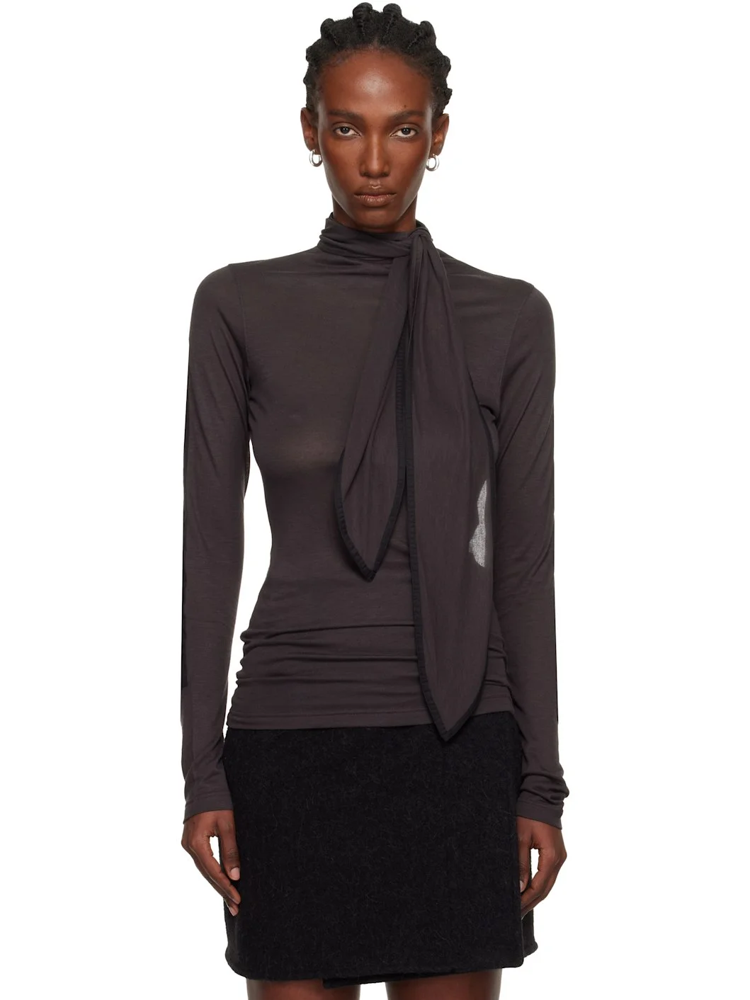 Knit viscose- and silk-blend turtleneck. · Wraparound self-tie fastening at collar · Plain-woven cotton patch at sleeves · Keyhole cutout at back collar Supplier color: Coal Body: 85% viscose, 15% silk. Trim: 100% cotton. Made in Portugal 252646F099000