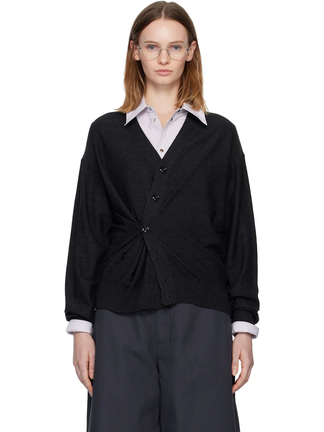 Knit wool-blend cardigan. · Y-neck · Rib-knit hem and cuffs · Button closure · Button fastening at side seam for offset styling Supplier color: Anthracite 50% acrylic, 50% wool. Made in Portugal 252646F095000