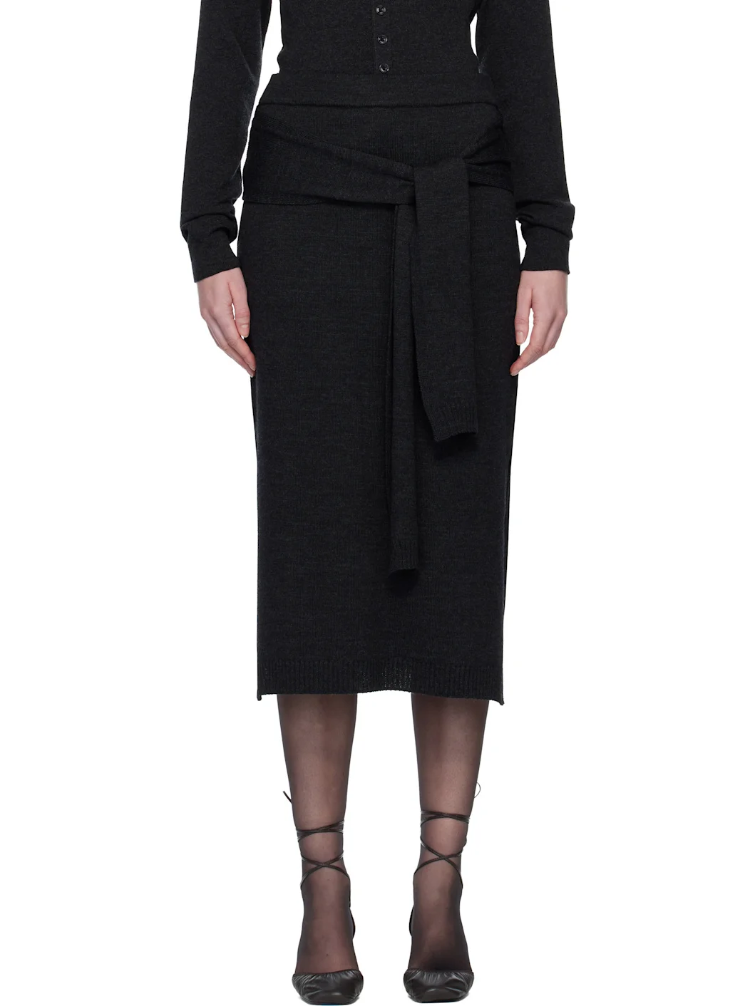 Knit wool-blend midi skirt. · Elasticized waistband · Knit self-tie straps at front · Foldover panel at back waist · Rib-knit hem · Vented side seams Supplier color: Anthracite 50% wool, 50% acrylic. Made in Portugal 252646F092003