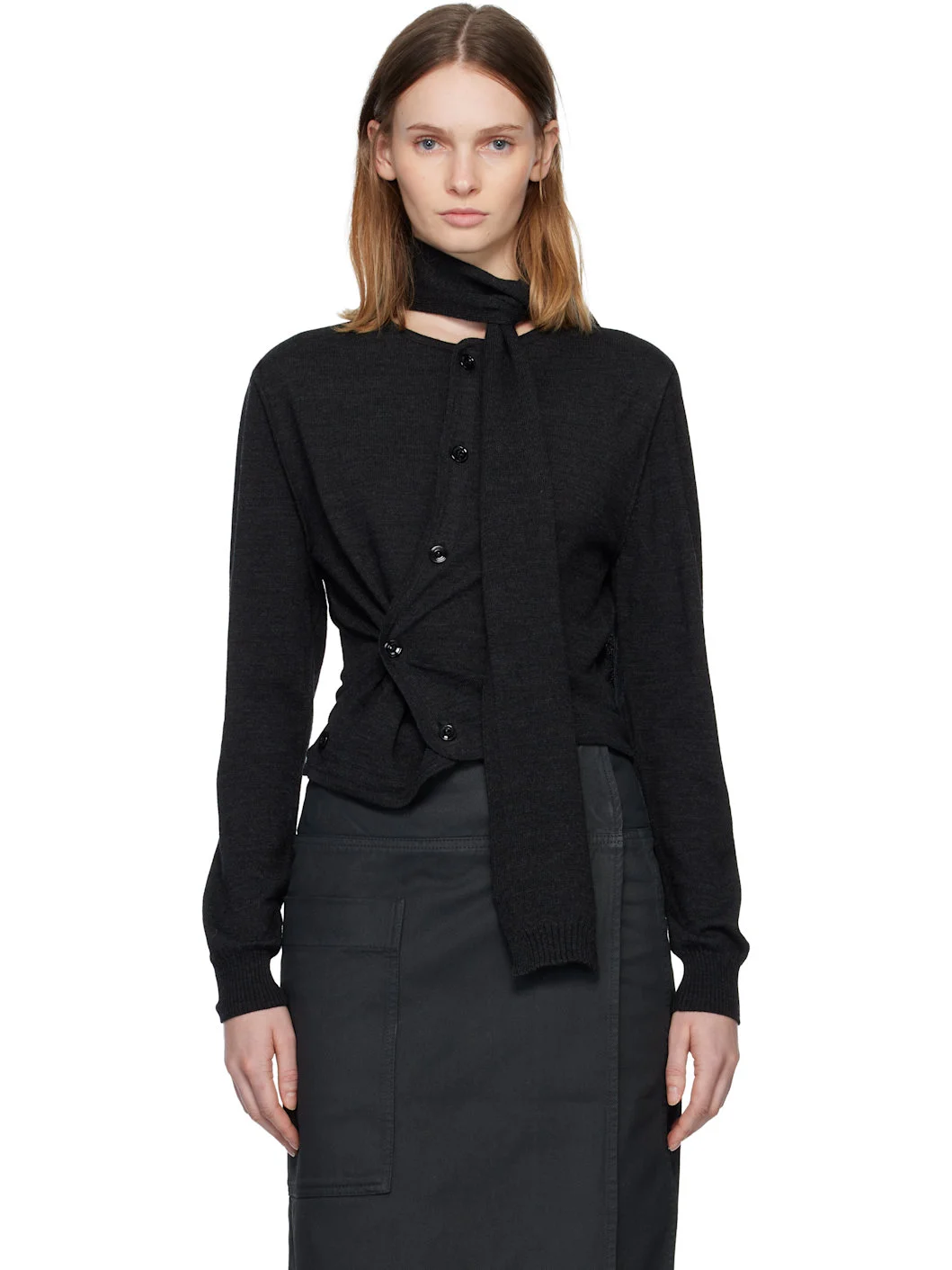 Knit wool-blend cardigan. · Wrap construction · Rib-knit crewneck, hem, and cuffs · Integrated self-tie scarf at collar · Button closure · Button fastening at side seam for offset styling Supplier color: Anthracite 50% acrylic, 50% wool. Made in Portugal 252646F095004
