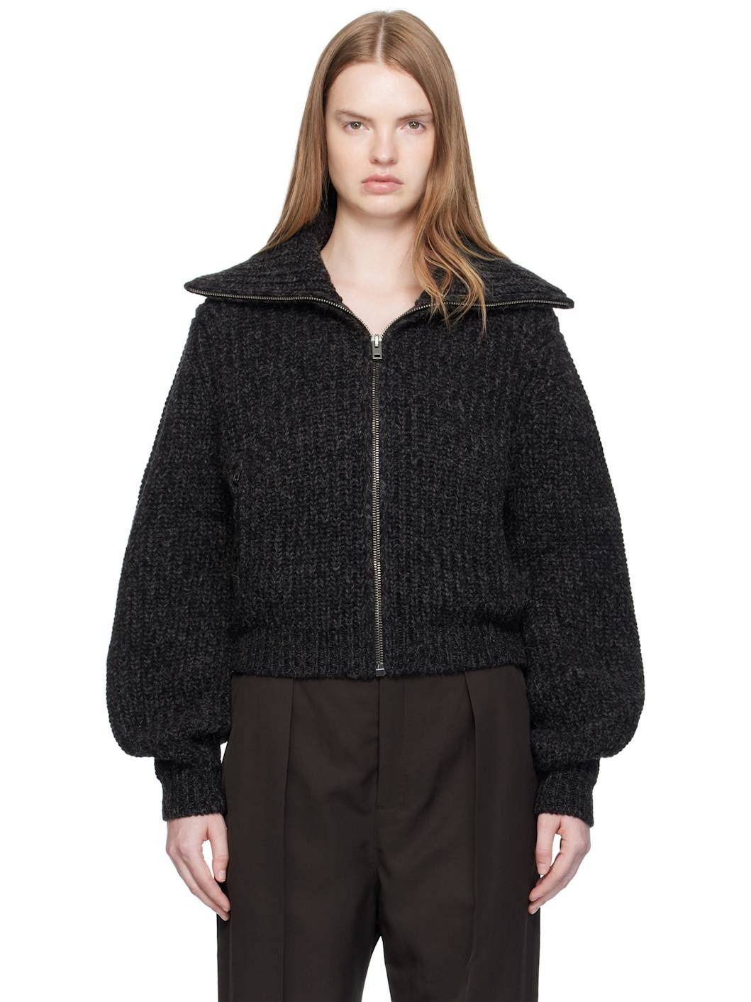 Rib-knit alpaca- and yak-blend cardigan. · Marling throughout · Funnel neck · Zip closure · Zip pockets at front · Cropped hem · Dropped shoulders Supplier color: Black/Mink brown 50% alpaca, 50% yak. Made in Italy 252646F097002