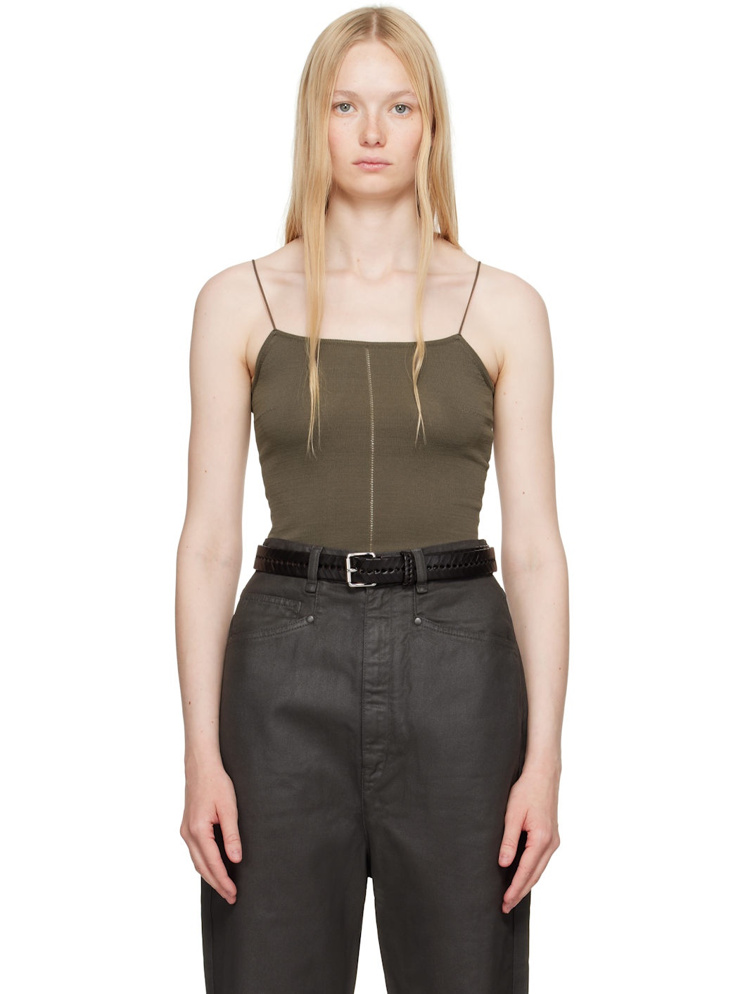 Knit viscose-blend tank top. · Rib-knit scoop neck and curved hem · Pointelle seam at front and back · Fixed spaghetti straps Supplier color: Dark khaki 75% viscose, 25% polyamide. Made in Italy 251646F111001
