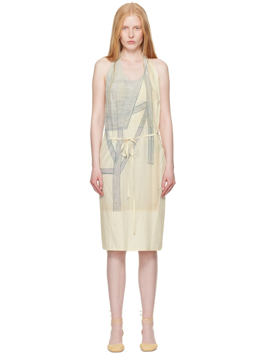 Viscose sateen midi dress. Graphic printed throughout. · Wrap construction · Scoop neck · Self-tie closure · Self-tie halter strap · Open back · Partially lined · Silver-tone hardware Featuring artwork by Philippe Weisbecker. Supplier color: Creamy white/Grey Body: 100% viscose. Lining: 69% lyocell, 31% polyamide. Made in Portugal 251646F054007