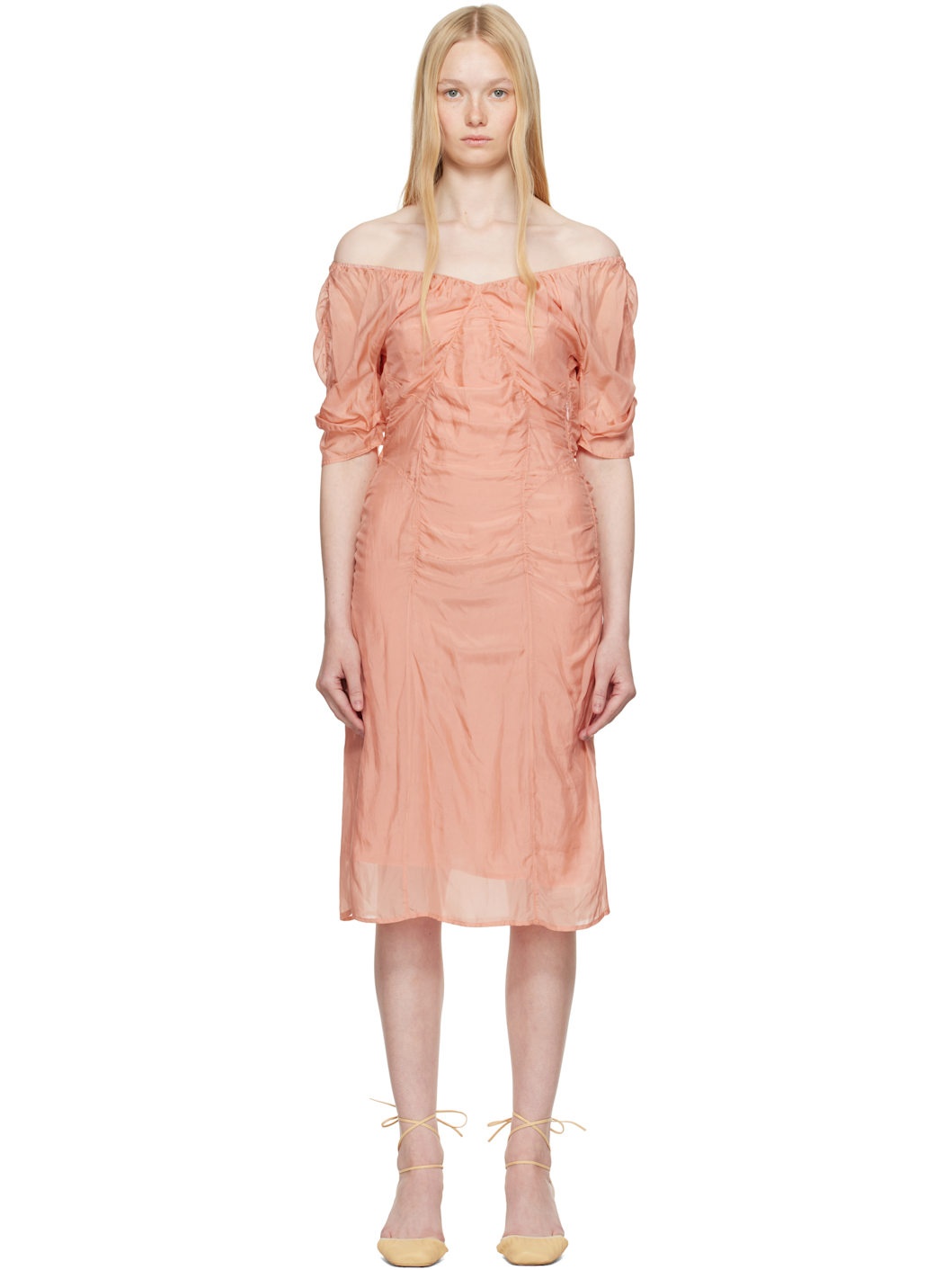 Crinkled silk chiffon midi dress. Ruching and gathering throughout. · Partially elasticized V-neck · Concealed zip closure at side seam · Full cotton voile lining Supplier color: Light coral Body: 100% silk. Lining: 100% cotton. Made in Portugal 251646F054013