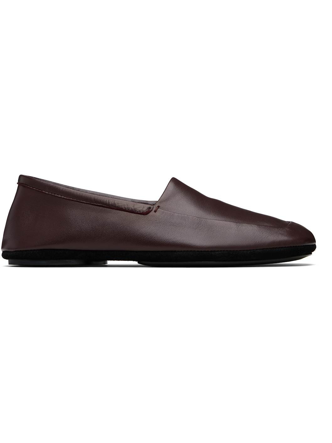 Grained nappa lambskin loafers. · LWG Gold-certified leather · Square toe · Collapsible heel counter · Leather lining · Suede midsole · Leather island sole with rubber heel Supplier color: Dark Eggplant Upper: lambskin. Sole: leather, rubber. Made in Portugal 252646F121001