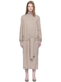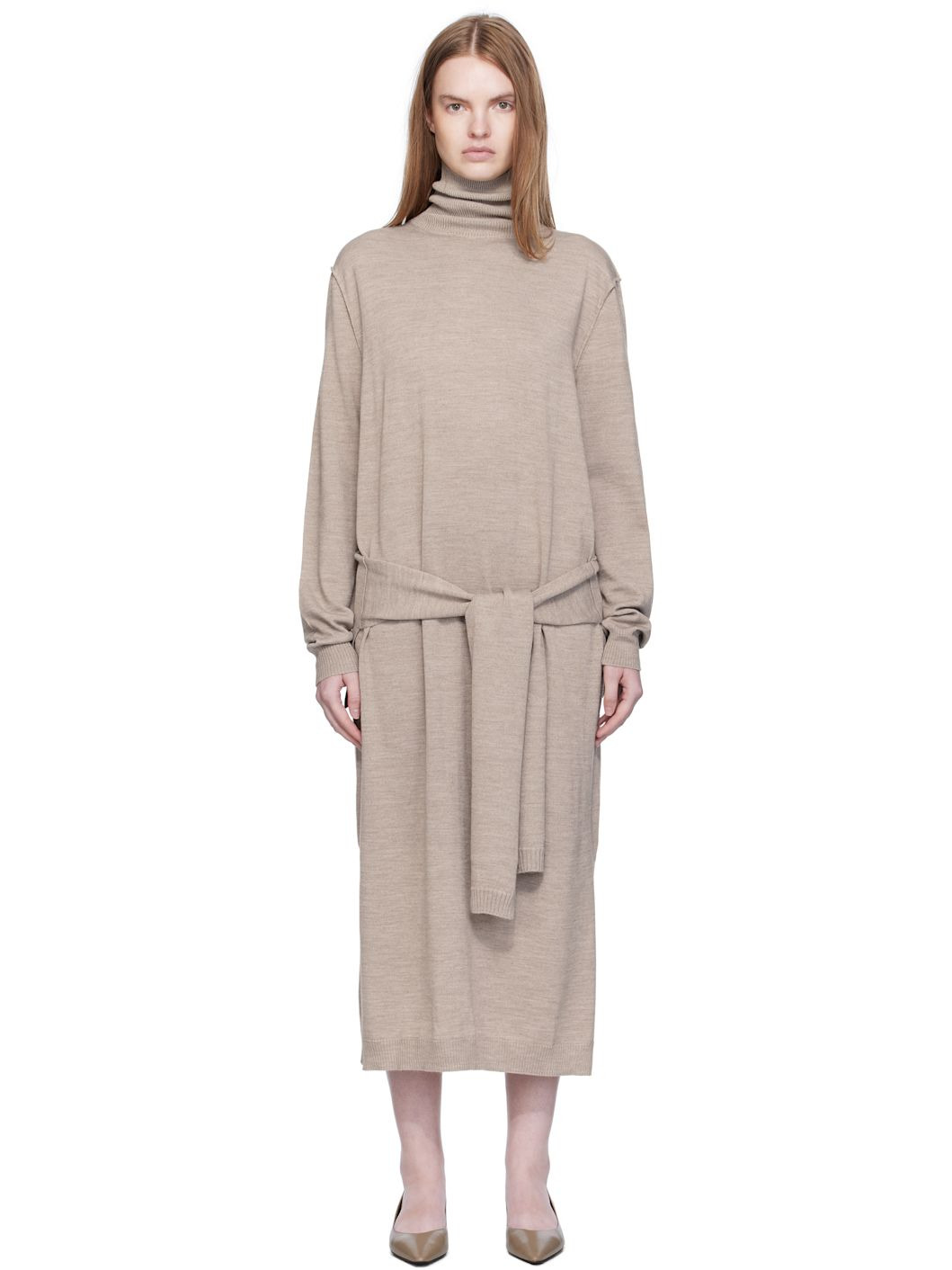 Knit wool-blend midi dress. · Exposed seams throughout · Rib-knit turtleneck, hem, and cuffs · Self-tie sweater-style panel at waist · Vented side seams Supplier color: Light taupe 50% wool, 50% acrylic. Made in Portugal 252646F054009