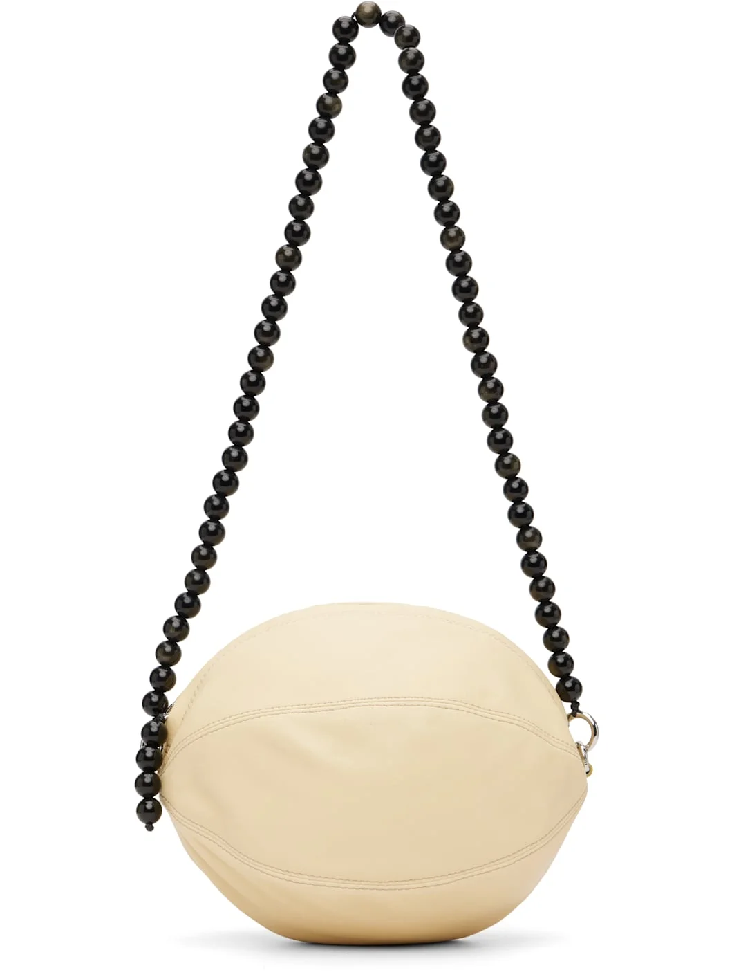 Buffed nappa lambskin pouch. · LWG Silver-certified · Paneled construction · Detachable beaded shoulder strap · D-ring at sides · Zip closure · Silk satin lining · Logo-engraved silver-tone hardware · H6.5" x W9" x D1" Supplier color: Custard Body: 100% lambskin. Lining: 100% silk. Made in Spain 252646F045000