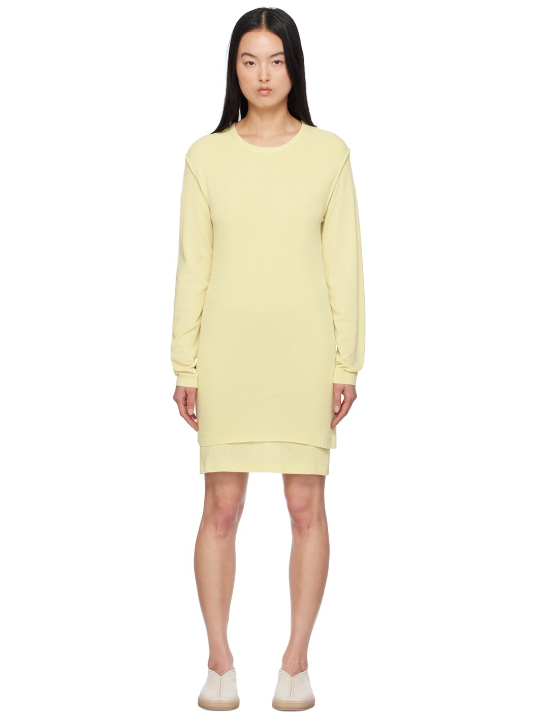 Knit cotton dress. · Layered construction · Rib knit crewneck, hem, and cuffs · Dropped shoulders · Detachable sleeveless dress-style overlay for alternate styling Supplier color: Pale canary 100% cotton. Made in France 241646F054020