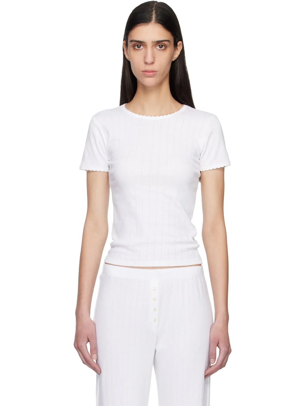 Cotton pointelle T-shirt. Scalloped edge at rib-knit crewneck and cuffs. Supplier color: White 100% cotton. Made in United States 261793F110018