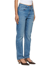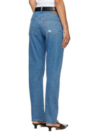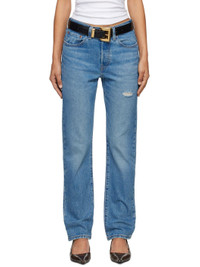 Straight-leg stretch denim jeans. Fading and whiskering throughout. · Mid-rise · Belt loops · Five-pocket styling · Button-fly · Leather logo patch at back waistband · Logo flag at back patch pocket · Logo-engraved silver-tone hardware · Contrast stitching in tan Supplier color: Historically blue