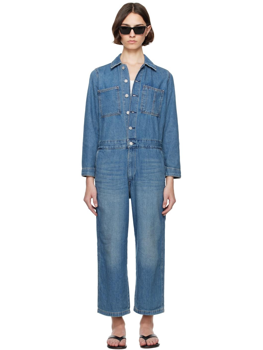 Straight-leg non-stretch cotton- and linen-blend denim jumpsuit. Fading and whiskering throughout. · Spread collar · Button closure · Patch pockets at chest · Four-pocket styling · Zip fly · Buttoned barrel cuffs · Logo flag at back pocket · Logo-engraved silver-tone hardware · Contrast stitching in tan Supplier color: Stop flaxing jumpsuit/Medium wash 85% cotton, 15% linen. Made in Sri Lanka 251099F070009