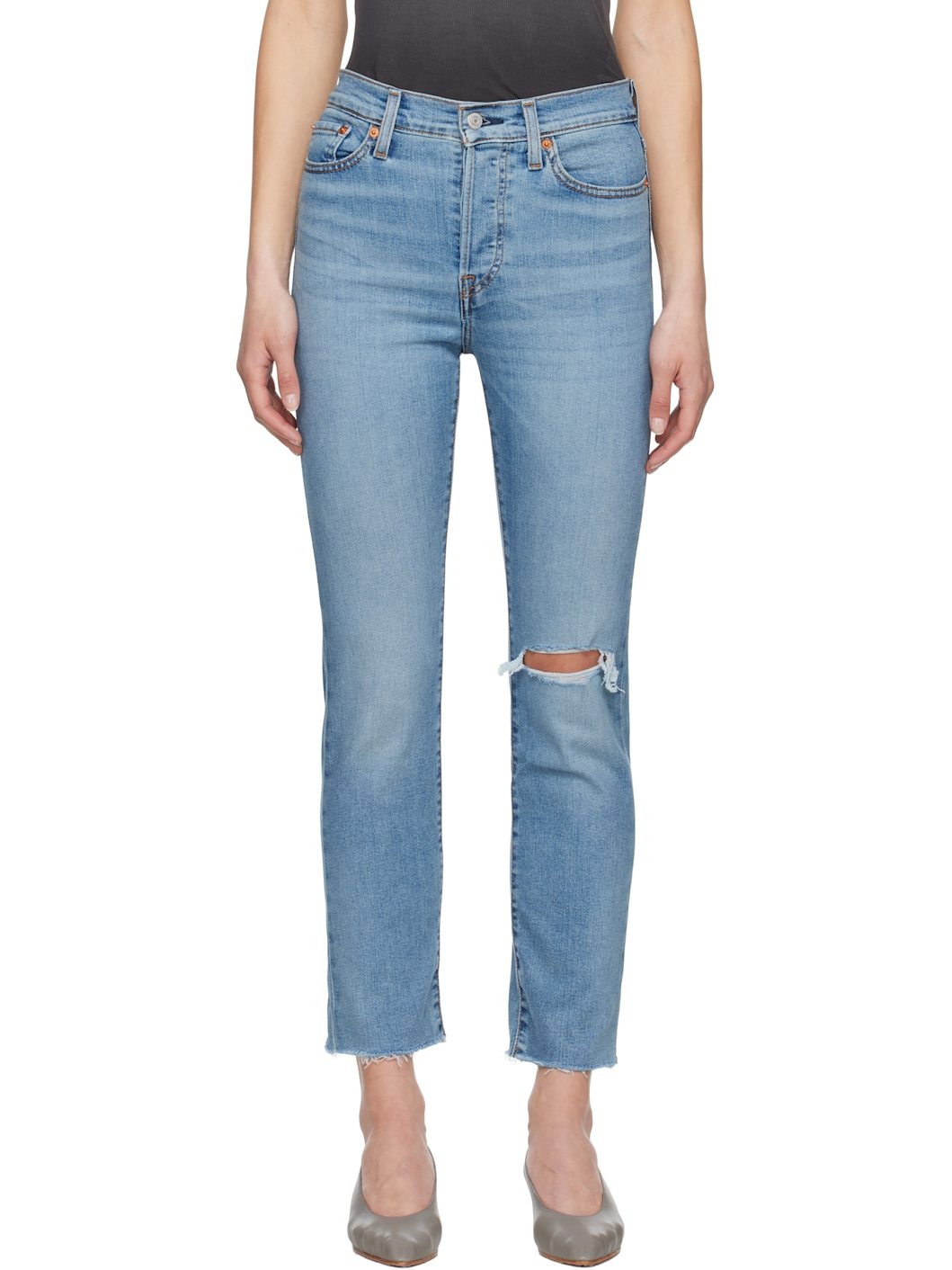 Straight-leg stretch denim jeans. Fading, whiskering, and distressing throughout. · High-rise · Belt loops · Five-pocket styling · Button fly · Rip at knee · Cropped legs · Raw edge at cuffs · Jacron logo patch at back waistband · Logo flag at back pocket · Logo-engraved silver- and copper-tone hardware · Contrast stitching in tan Supplier color: Night sight 85% cotton, 14% polyester, 1% elastane. Made in Sri Lanka 251099F069088
