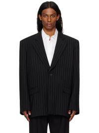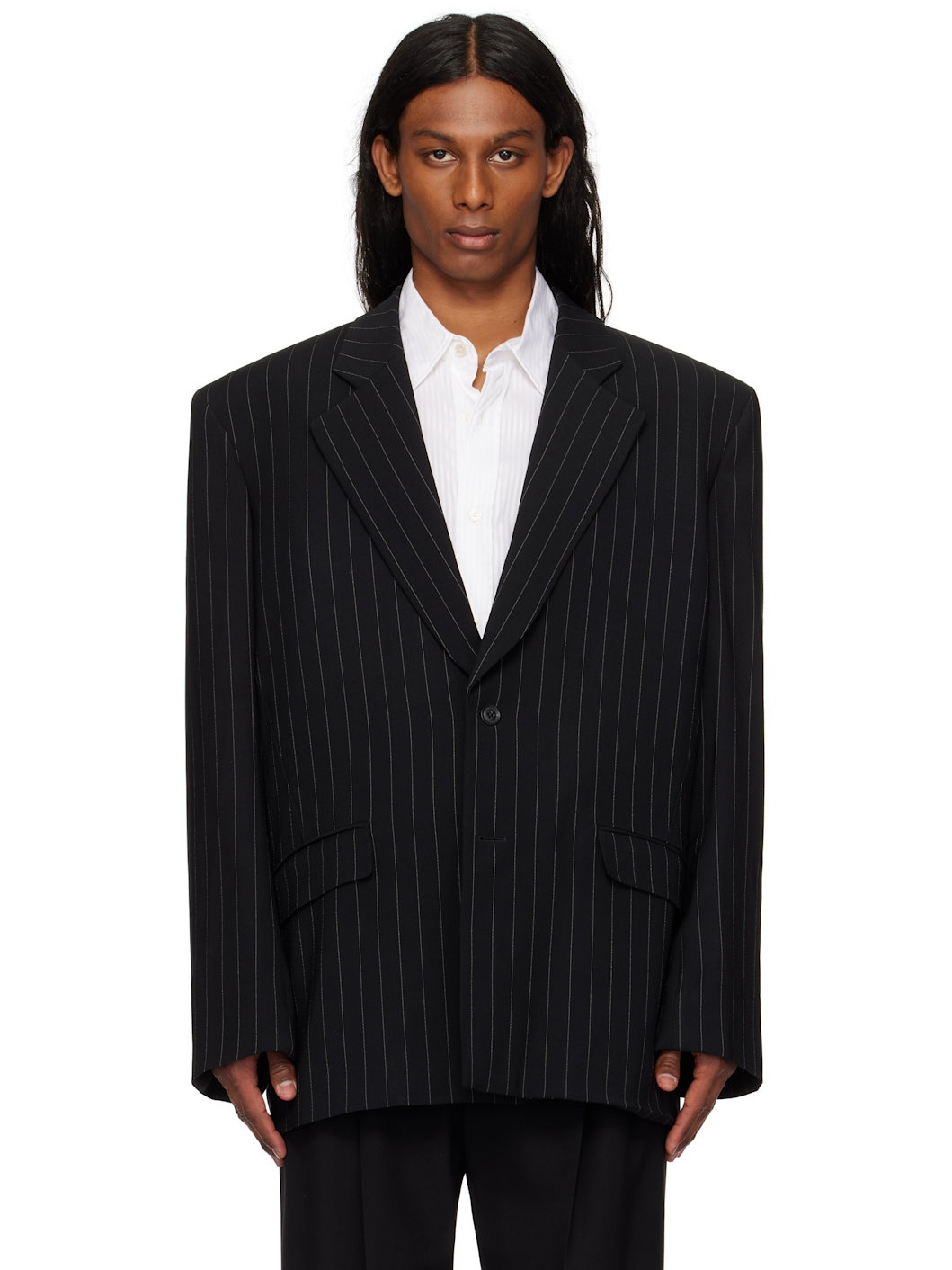 Oversized viscose- and virgin wool-blend barathea blazer. Pinstripes throughout. · Peaked lapel · Button closure · Darts at front · Flap pockets · Padded shoulders · Welt pockets at interior · Full twill lining Supplier color: Pinstripes Body: 55% viscose, 44% virgin wool, 1% polyester. Lining: 100% viscose. Made in Romania 251617M195002