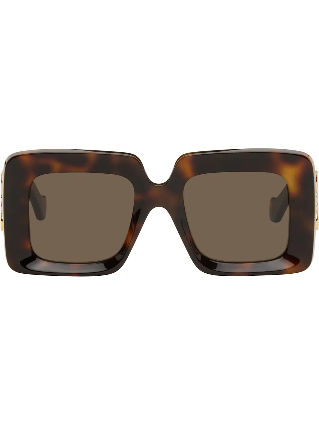 Square tortoiseshell acetate-frame sunglasses. · Brown lenses · 100% UVA/UVB protection, category 3 · Integrated nose pads · Logo hardware at temples · Exposed core wires · Includes pouch · Size: 51.21 145 Supplier color: Havana Acetate. Made in Italy 252677F005082
