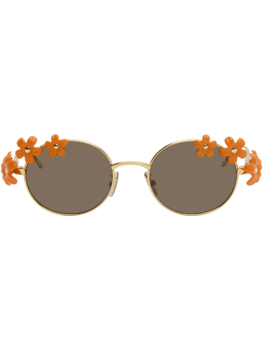 Round metal-frame sunglasses. · Brown lenses · Adjustable rubber nose pads · Floral hardware at face and temples · Logo engraved at temples · Includes pouch · Size: 51.30 140 Supplier color: Shiny endura gold Metal. Made in Italy 252677M134003