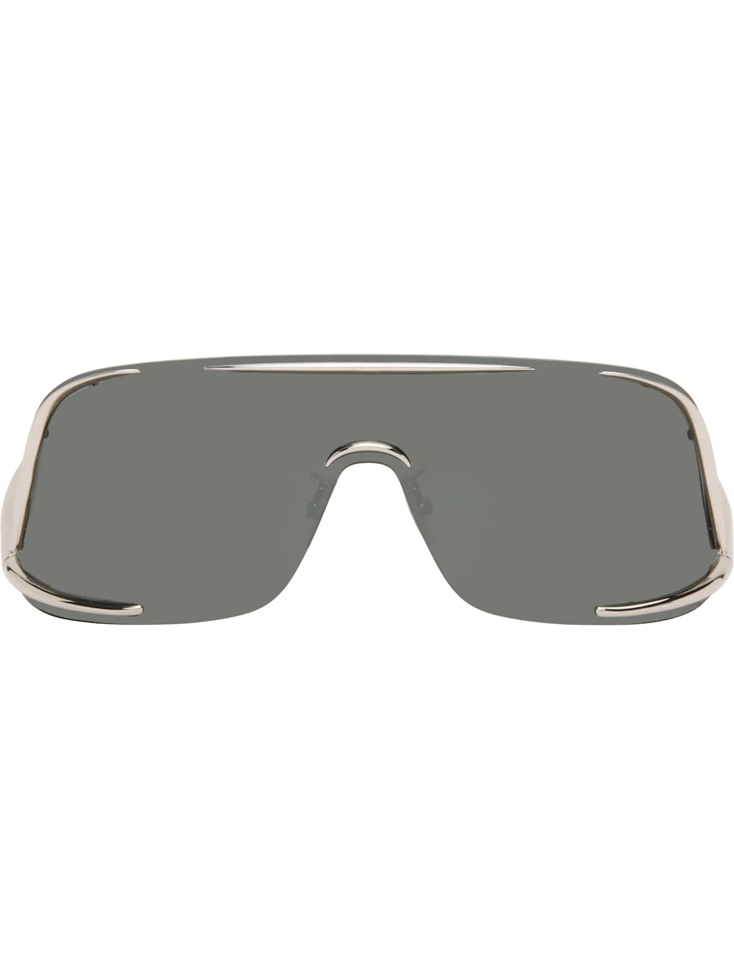Rimless metal-frame sunglasses. · Mirror-polished hardware at face · Black shield-style lens · UVA/UVB protection · Logo etched at lens and temples · Rubber nose pads · Leather pouch included · Size: 120.141 Supplier color: Shiny Palladium Metal. Made in Italy 261677F005001