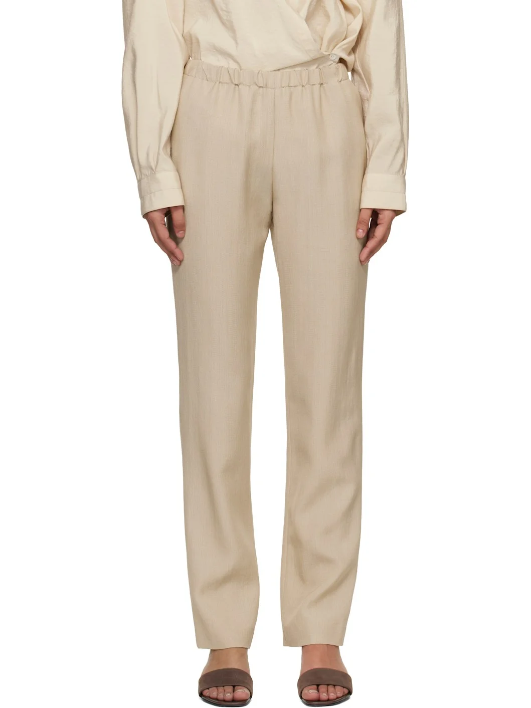 Viscose- and virgin wool-blend canvas trousers. · OEKO-TEX Standard 100 certified · Straight-leg · Mid-rise · Elasticized waistband · Two-pocket styling Supplier color: Beige Body: 65% viscose, 35% virgin wool. Trim: 100% viscose. Made in Romania 261473F087002