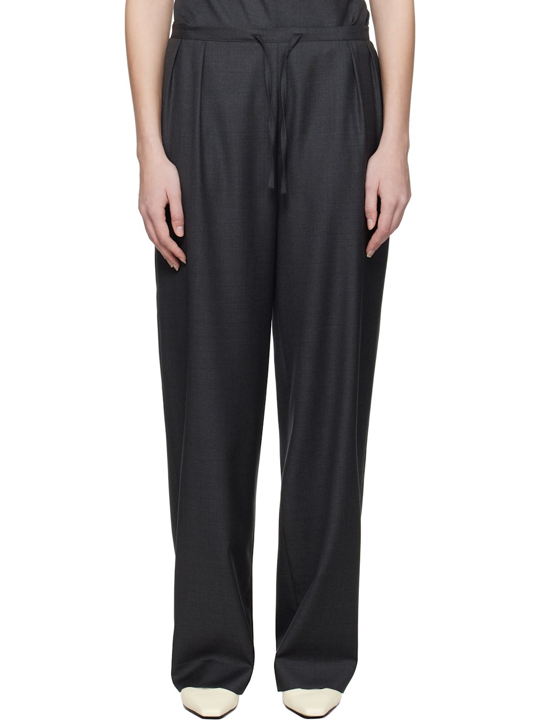 Plain-woven OEKO-TEX® -certified virgin wool trousers. · Drawstring at partially elasticized waistband · Two-pocket styling · Pleats at front waistband Supplier color: Black melange 100% virgin wool. Made in Romania 251473F087004