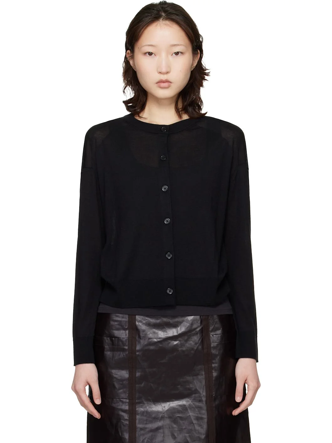 Lightweight knit cashmere cardigan. · Certified OEKO-TEX® Standard 100 · Rib-knit round neck, hem, and cuffs · Button closure · Offset shoulder seams Supplier color: Black 100% cashmere. Made in Italy 261473F095002