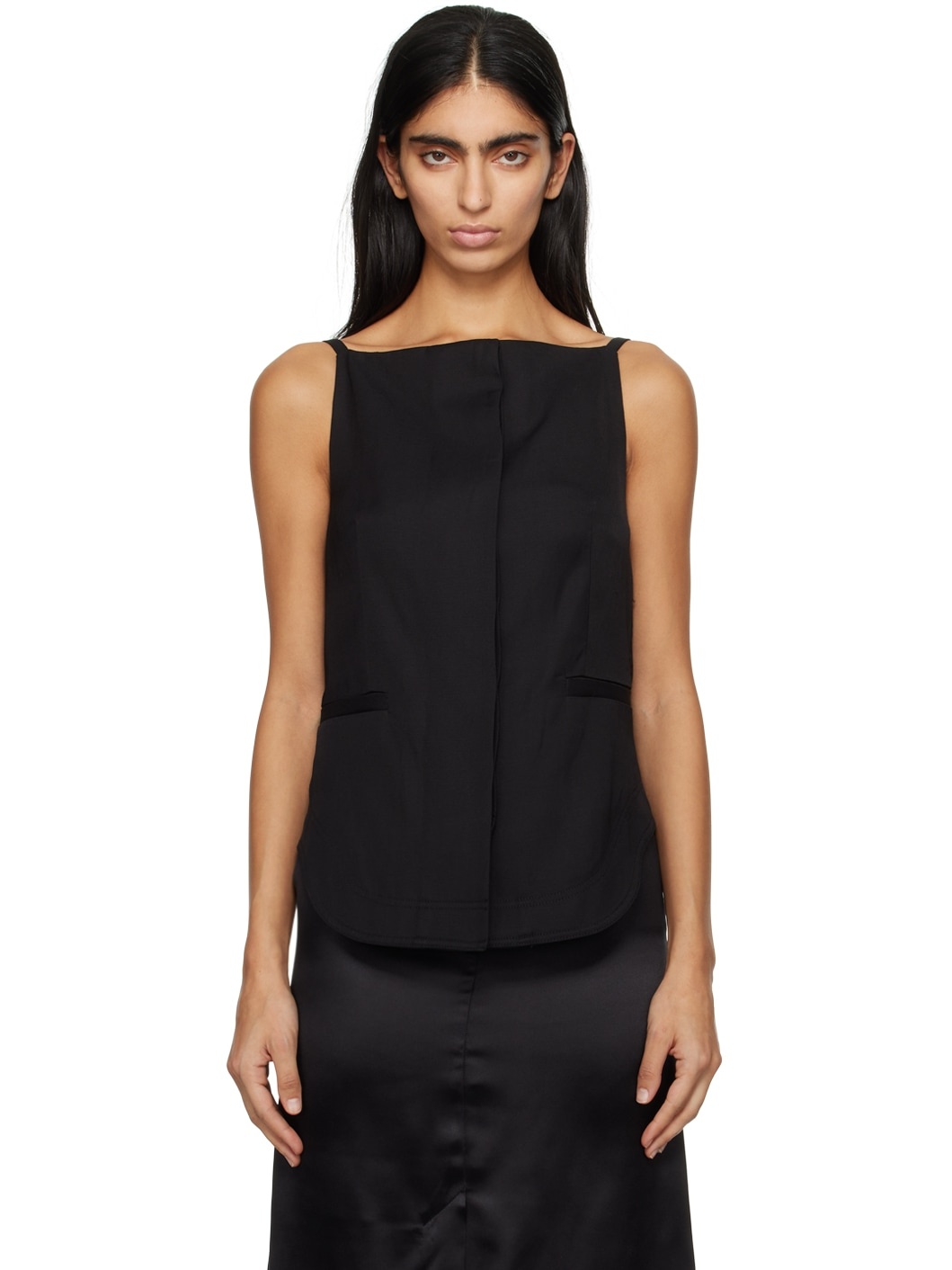 OEKO-TEX® Standard 100-certified viscose- and linen-blend twill camisole. · Square neck · Concealed button closure · Darts at front · Welt pockets · Shirttail hem · Fixed spaghetti straps · Full plain-woven viscose lining Supplier color: Black Body: 85% viscose, 15% linen. Lining: 100% viscose. Made in Romania 241473F111012