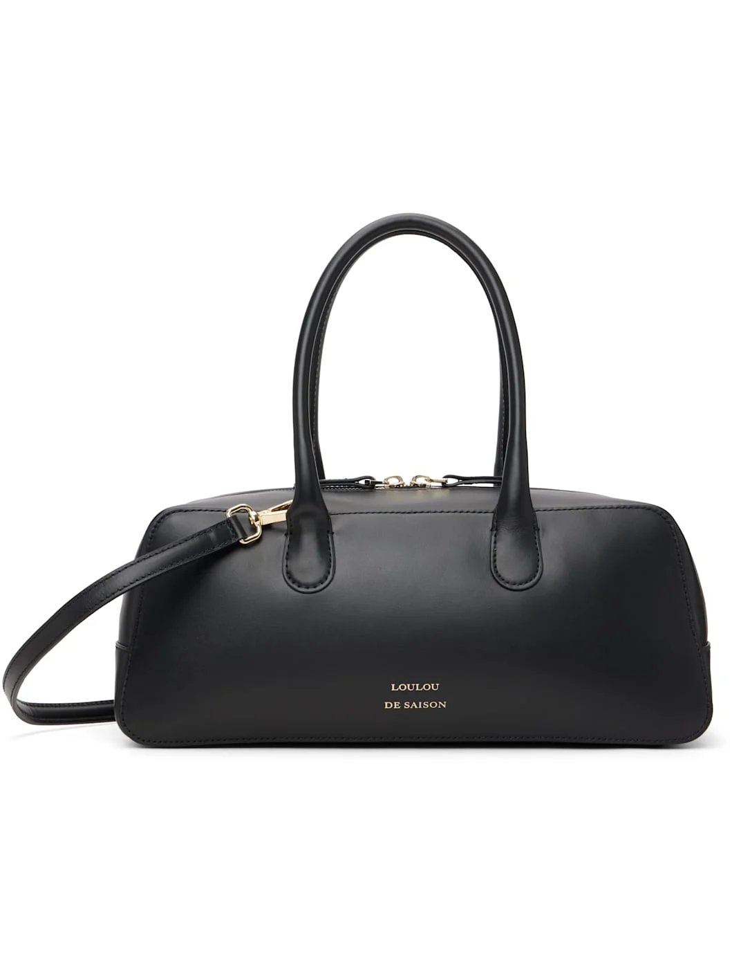 Buffed calfskin shoulder bag. · Rolled carry handles · Adjustable and detachable crossbody strap · Logo stamp at face · Two-way zip closure · Zip pocket at interior · Twill lining · H5.25" x W13" x D5" Supplier color: Black Calfskin. Made in Italy 261473F048001