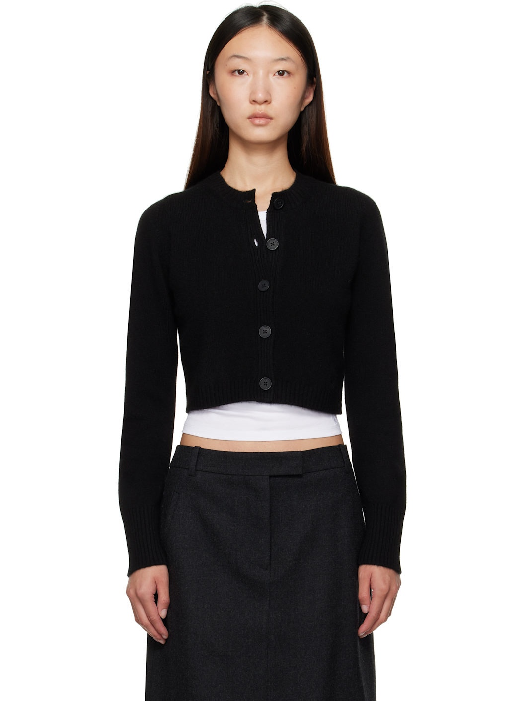 Knit cashmere cardigan. · OEKO-TEX® STANDARD 100-certified · Rib-knit crewneck, placket, hem, and cuffs · Button closure · Logo embroidered at front hem · Cropped hem · Saddle shoulders Supplier color: Black 100% cashmere. Made in Italy 252473F095009