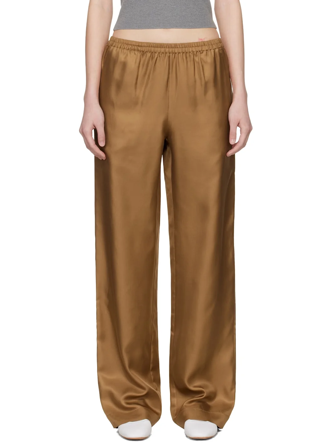 Lightweight silk satin twill trousers. · Certified OEKO-TEX® Standard 100 · Elasticized waistband · Three-pocket styling Supplier color: Macadamia 100% silk. Made in Italy 261473F087008