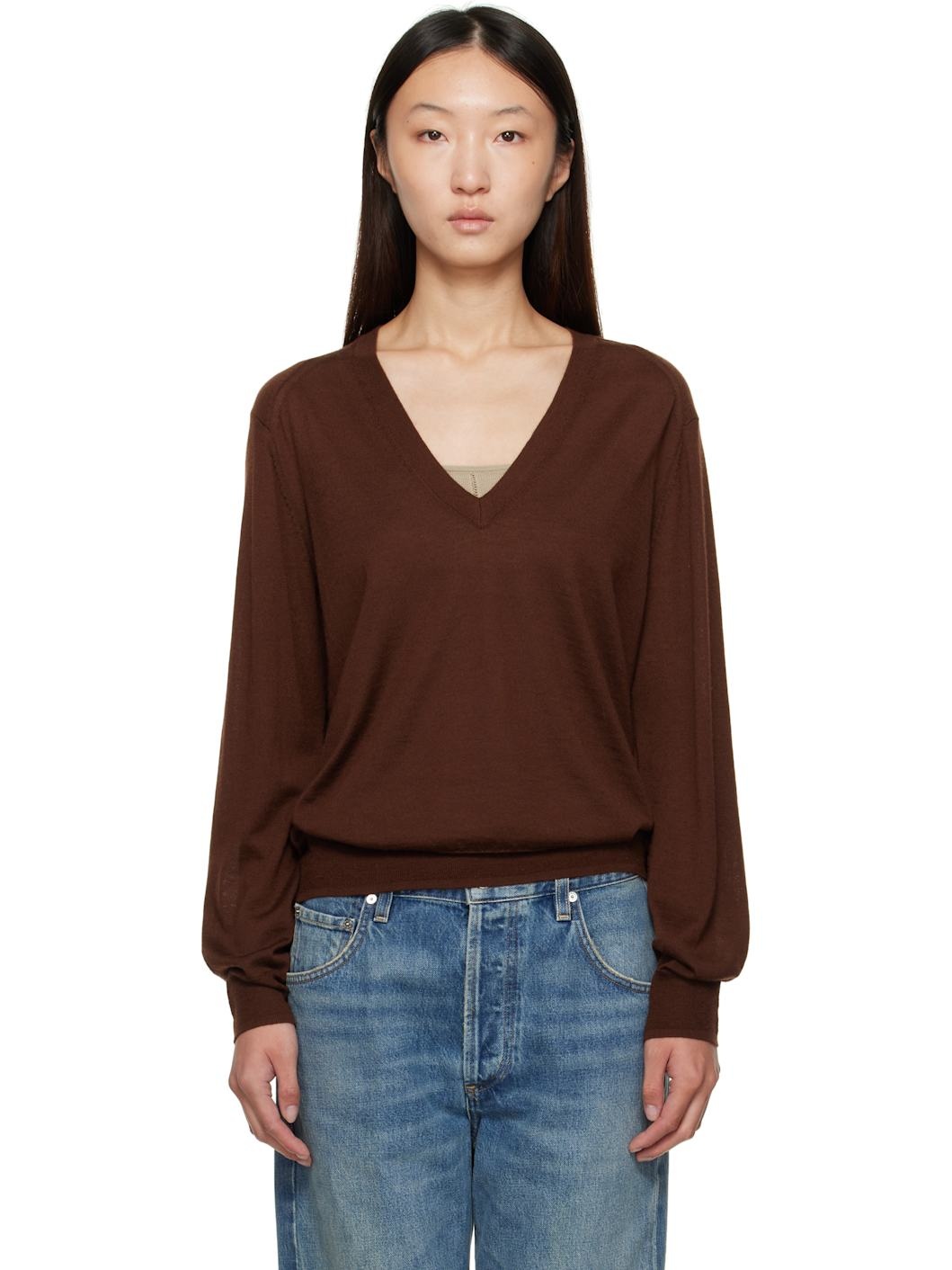 Knit cashmere sweater. · OEKO-TEX® STANDARD 100-certified · Rib-knit V-neck, hem, and cuffs · Dropped saddle shoulders Supplier color: Brown 100% cashmere. Made in Italy 252473F100006